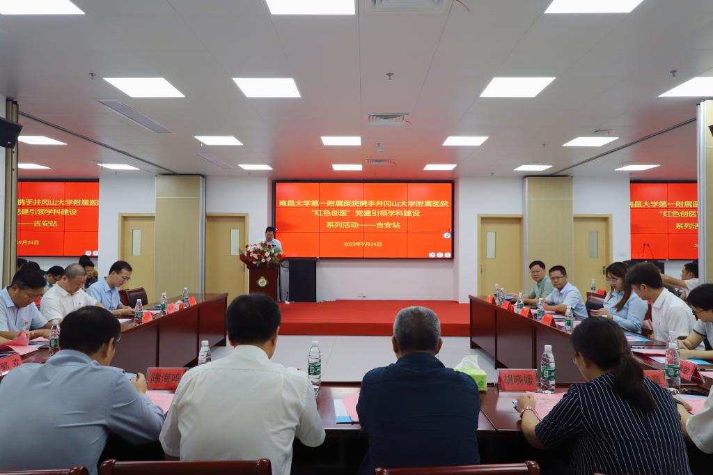 为推进党建工作和业务工作“双提质”,进一步提高我院学科建设水平,提升医疗服务质量,推进我院创伤急救中心建设,9月24日上午,中国创伤联盟副主席、南昌大学第一附属医院党委委员、副院长曾元临,南昌大学第一附属医院急诊外科主任、江西省创伤急救中心主任陈海鸣一行5人莅临井冈山大学附属医院开展“红色创医”党建引领学科建设系列活动——吉安站。井冈山大学党委常委、组织部部长欧阳杰,市委卫健工委委员、市卫健委副主任胡晓媛出席并讲话,区县联盟医院有关代表,医院领导班子成员、全体中层干部、创伤急救中心委员会成员以及急诊科、创伤急救中心、院前急救科医护人员参加,活动由院党委副书记、院长谭立宇主持。