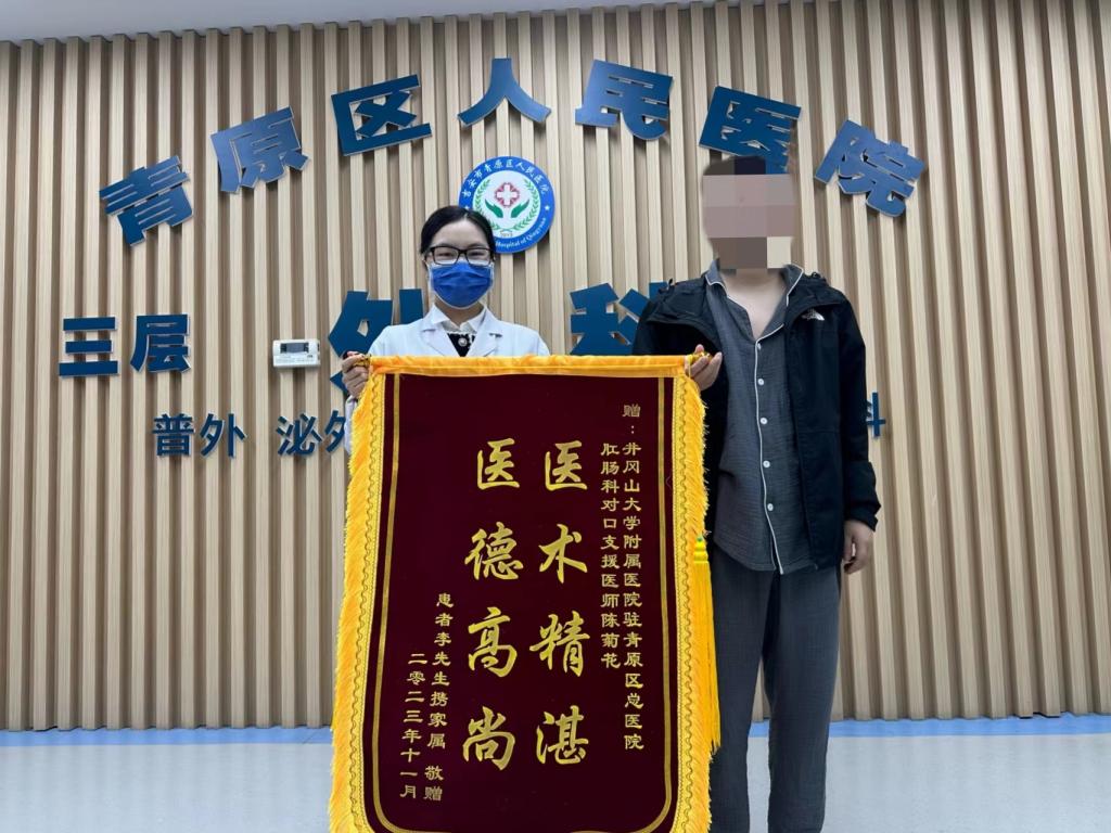 11月9日上午,吉安市青原区河东街道村民李先生将一面写有“医术精湛、医德高尚”的锦旗送到了我院驻青原区总医院肛肠科对口支援主治医师陈菊花的手中,表达了对陈医师肛肠医术精湛、医德高尚及优质医疗服务的感激之情。