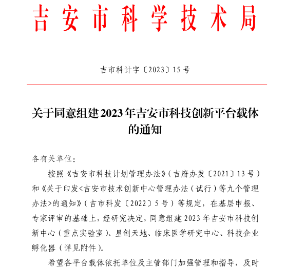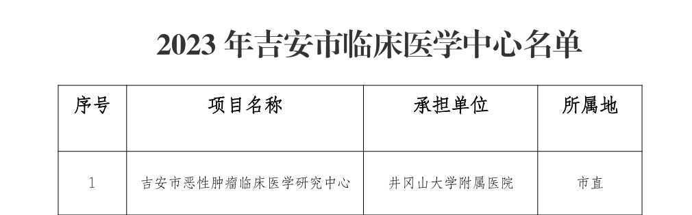 近日,吉安市科技局发布了同意组建2023年市级科技创新平台载体名单,井冈山大学附属医院申报的吉安市恶性肿瘤临床医学研究中心成功获批,这是继2023年6月我院获得江西省恶性肿瘤临床医学研究中心吉安分中心后,再次获得市级恶性肿瘤临床医学研究中心。至此,我院获得恶性肿瘤疾病省级分中心和市级临床医学研究中心双授牌。