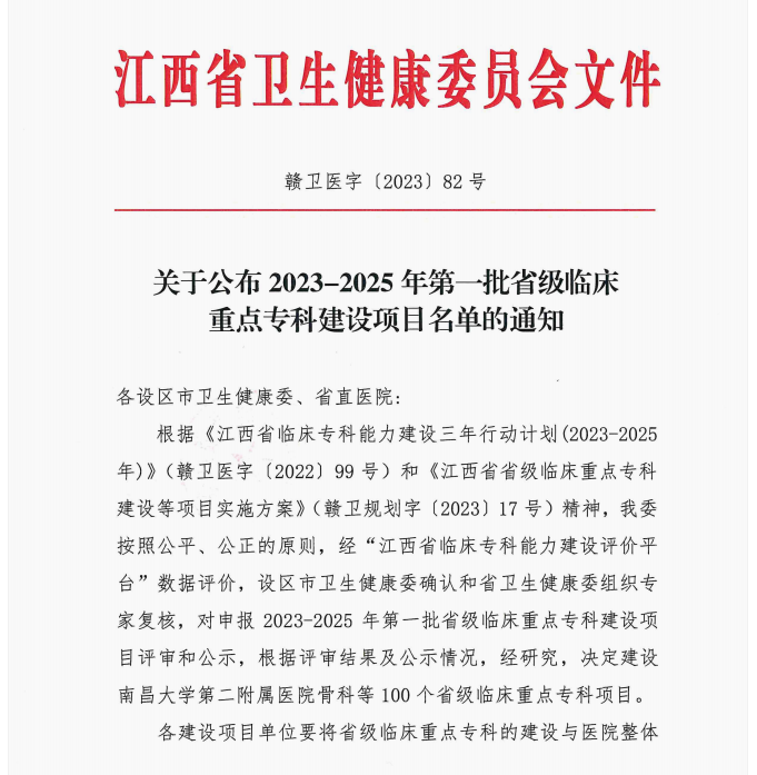 近日,江西省卫健委公布了2023-2025年第一批省级临床重点专科建设项目(赣卫医〔2023〕82号),井冈山大学附属医院骨科、神经内科、重症医学科、普外科成功入选,标志着我院重点专科建设又迈向了一个新台阶。