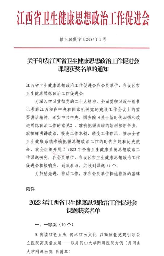 近日,江西省卫生健康思想政治工作促进会发布了2023年江西省卫生健康思想政治工作促进会课题获奖名单,井冈山大学附属医院党委申报《康续红色血脉,传承红医文化,以高质量党建引领公立医院高质量发展——以井冈山大学附属医院为例》课题荣获一等奖。