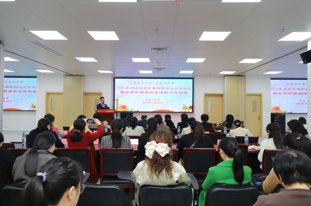 为进一步贯彻落实《关于印发吉安市落实进一步改善护理服务行动计划工作方案(2023-2025年)的通知》文件要求,更好地提高护理质量控制管理能力,切实推进护理质量水平同质化,保障患者安全,2024年3月23日,由吉安市护理质控中心主办、井冈山大学附属医院承办的2024年度吉安市护理质控中心工作会议暨全市护理质控管理能力培训班在井冈山大学附属医院新院区全科楼2楼学术报告厅举行。吉安市卫生健康委医政医管科科长邹建敏,井冈山大学附属医院党委副书记、院长谭立宇致辞,吉安市中心人民医院(上海市东方医院吉安医院)党委委员、副院长王小辉出席开幕式。会议还邀请了江西省护理学会理事长、省护理质控中心常务副主任、省肿瘤医院护理部主任洪金花,江西省人民医院护理部主任刘琳进行专题授课。来自全市各县区150余名护理管理人员参加。