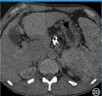 2C图示:利用单能80kev+iMAR算法组合来处理,这样既降低了金属伪影又保留了碘剂的浓度;2D图示:采用单能120kev来单独处理,发现金属伪影下降了,但是血管里的碘剂基本没有了,类似一个平扫了,这也再次佐证了随着电压的升高,增强的碘剂浓度会下降,而利用单能+迭代算法可有效地解决这一问题。