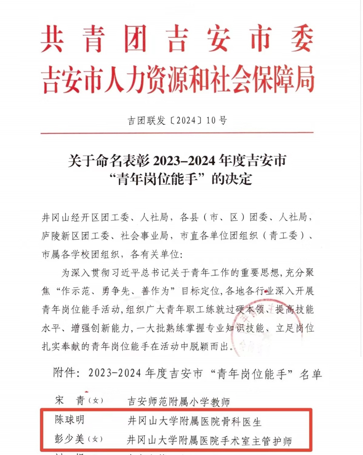 近日,共青团吉安市委员会、吉安市人力资源和社会保障局下发《关于命名表彰2023-2024年度吉安市“青年岗位能手”的决定》,井冈山大学附属医院骨科医生陈球明、手术室主管护师彭少美两位同志荣获“吉安市青年岗位能手”称号。(文图:刘婧 审核:刘婧 周臻 彭晓露)