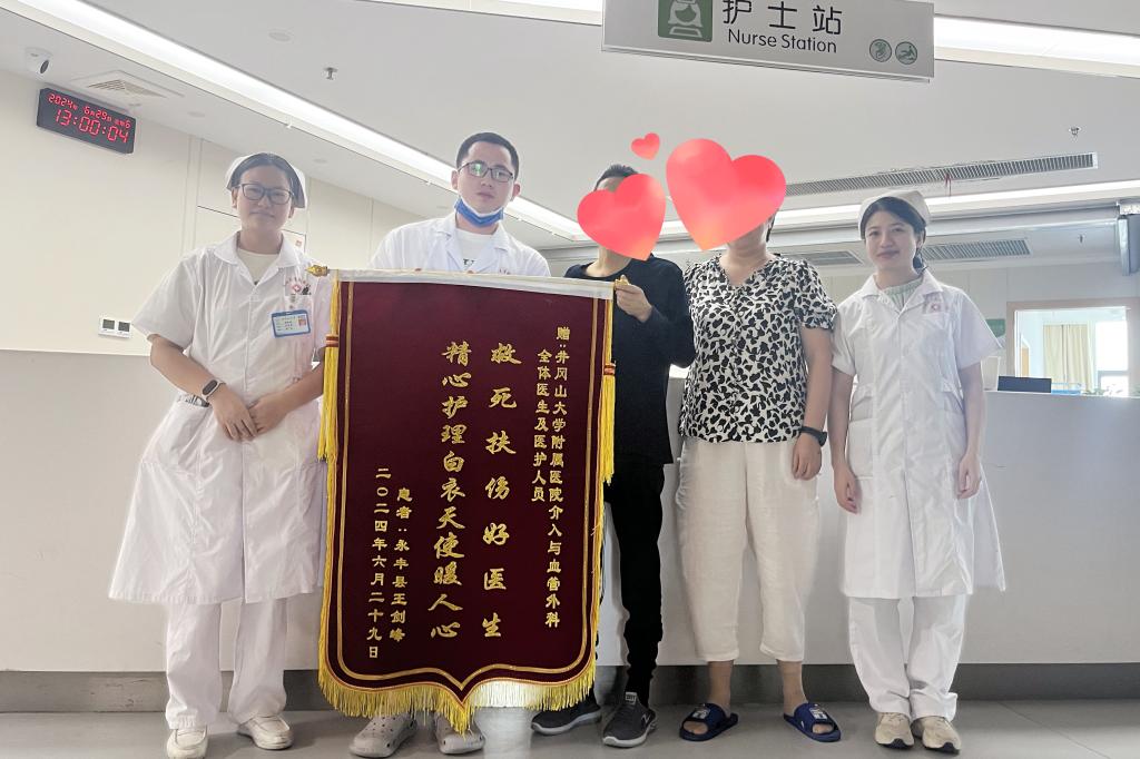一面面锦旗承载的不仅是患者对医护的感激之情,更是对介入与血管外科医疗技术和护理能力的极大肯定。未来,介入与血管外科将继续以患者满意为激励,不断落实优质服务内涵,以患者为中心,带给患者贴心和暖心,造福更多的患者。(文图:杨娟 审核:胡建明 周臻 彭晓露)