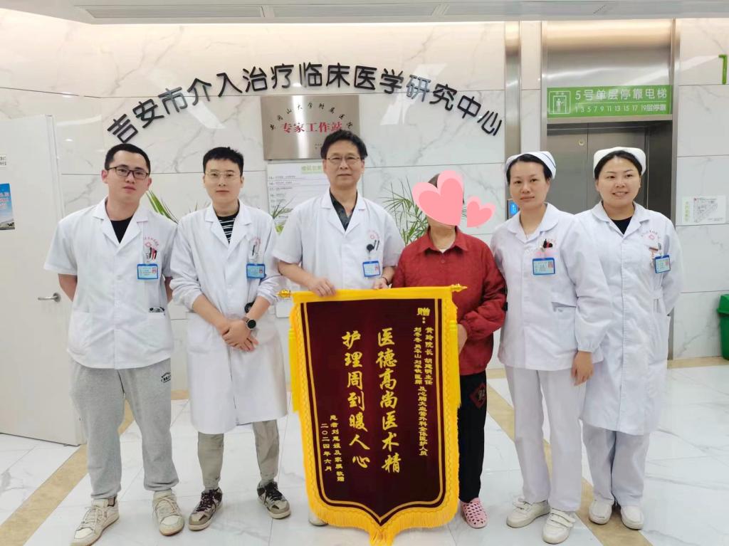 患者的满意是医务人员工作的最终目标。秉承一颗为民服务的初心,井冈山大学附属医院介入与血管外科医护人员凭借着高超的技术和精心的服务,屡屡收获患者好评,近日更是接连收到两位患者(来自54岁的王先生和73岁的刘女士)赠送的锦旗。火红的底色,跳动着医者护佑生命的热情;烫金的文字,铭刻着为民服务的初心。