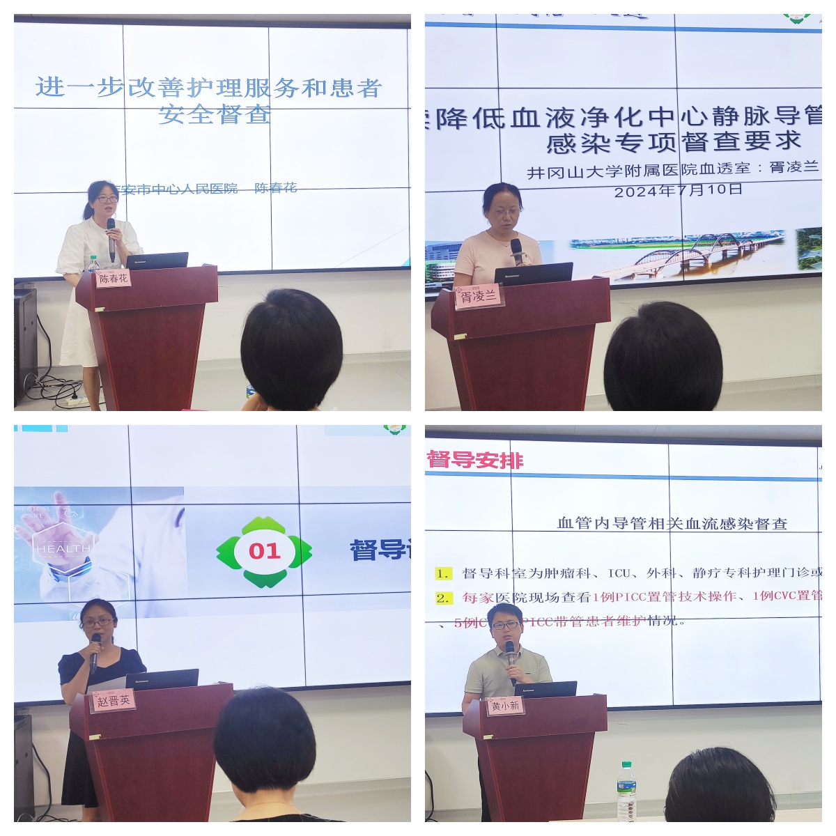 质控中心成员、吉安市中心人民医院大外科护士长陈春花、井冈山大学附属医院血透室护士长胥凌兰、井冈山大学附属医院泌尿外科护士长赵晋英、质控中心秘书黄小新根据省护理质控中心会议精神分别解读了促进护理服务改善及临床患者安全管理与实践、血液净化中心静脉导管相关血流感染防控、降低2期及以上院内压力性损伤发生率、降低手术患者术中相关意外伤害发生率及降低导管相关血流感染发生率的督导要求。通过质控标准的解读,让与会人员对质控管理的方向与重点有了更加清晰的认识。