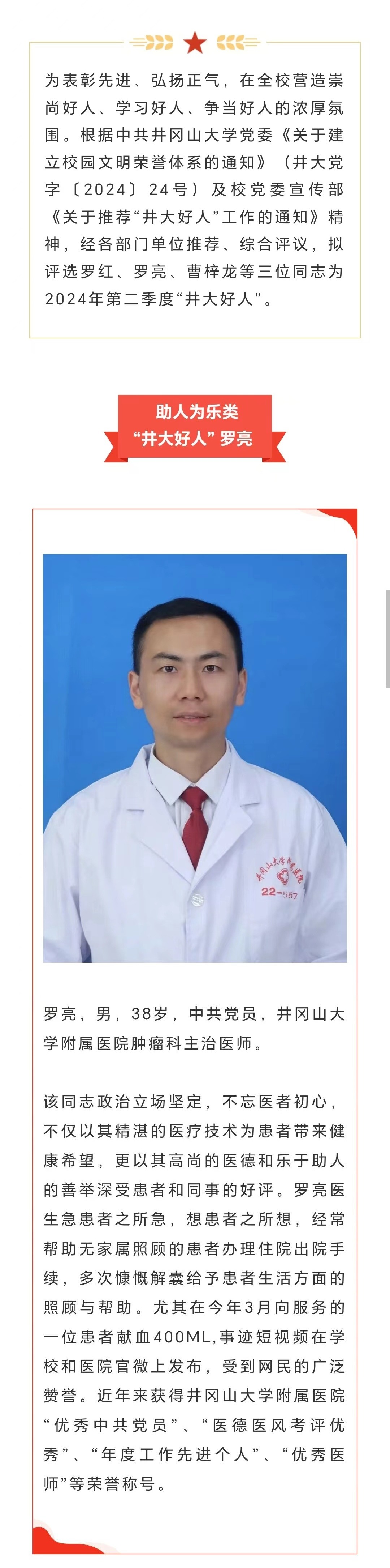 近日,井冈山大学发布2024年第二季度“井大好人“,井冈山大学附属医院肿瘤科罗亮等三位同志当选。(来源:井冈山大学官方微信号)