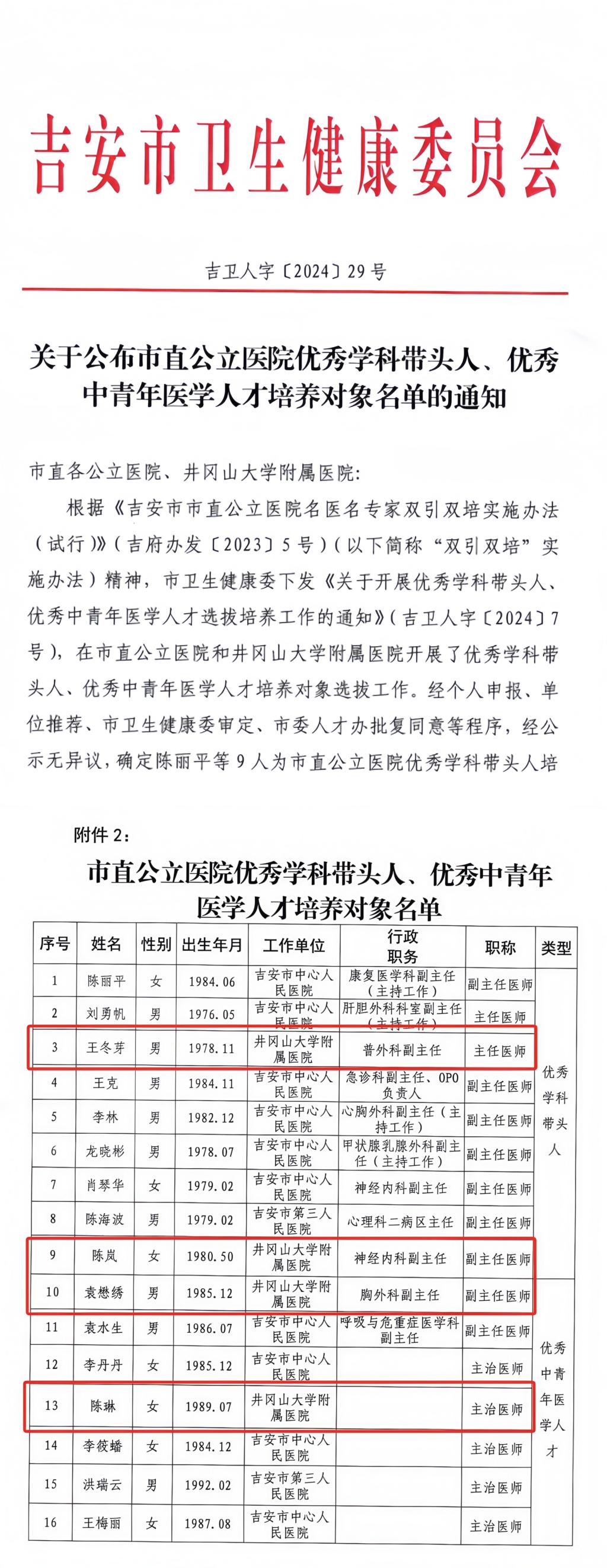 根据吉卫人字〔2024〕29号 《关于公布市直公立医院优秀学科带头人、优秀中青年医学人才培养对象名单的通知》文件通知,井冈山大学附属医院(临床医学院)王冬芽、陈岚评为市直公立医院优秀学科带头人培养对象,袁懋绣、陈琳评为市直公立医院优秀中青年医学人才培养对象。(文图:王慧华 审核:刘昱昕 周臻 彭晓露)