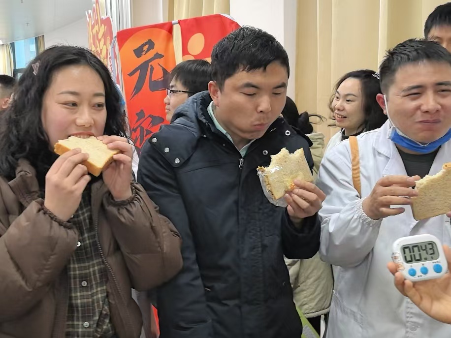 “贪吃蛇—吃面包挑战”,大家狼吞虎咽,争先恐后,周围笑声不断。