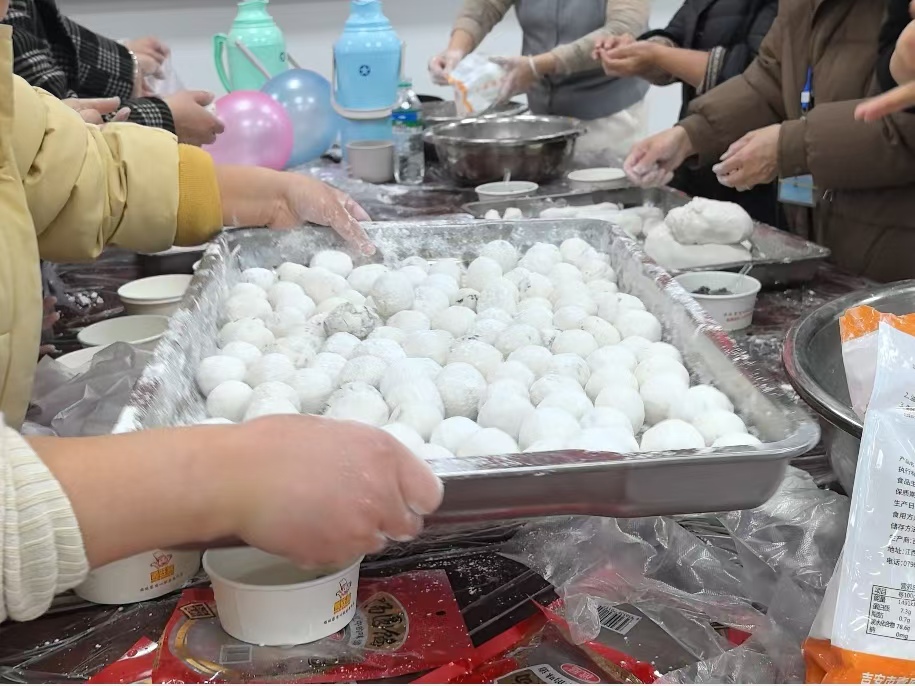 “暖心包汤圆”活动大家围在一起揉面、包馅、搓圆,一个个圆润饱满的汤圆整齐摆放。