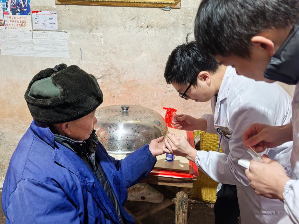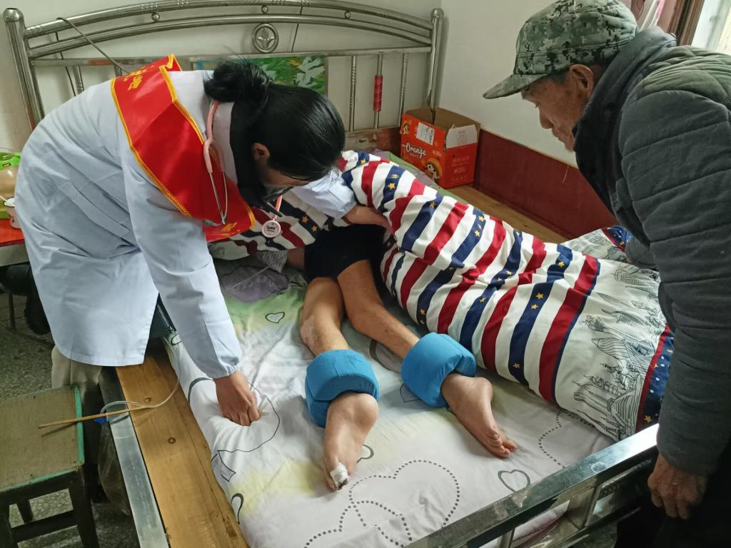 考虑到部分行动不便的居民,红医志愿服务队现场组建上门服务小组。他们带着医疗设备,走村入户,为那些行动不便、高龄村民、瘫痪家庭进行一对一的健康检查,包括量血压、测血糖等基础项目,并赠送生活物资。对于瘫痪在床的患者,专家们到床边耐心细致地检查身体状况,并指导如何正确护理。