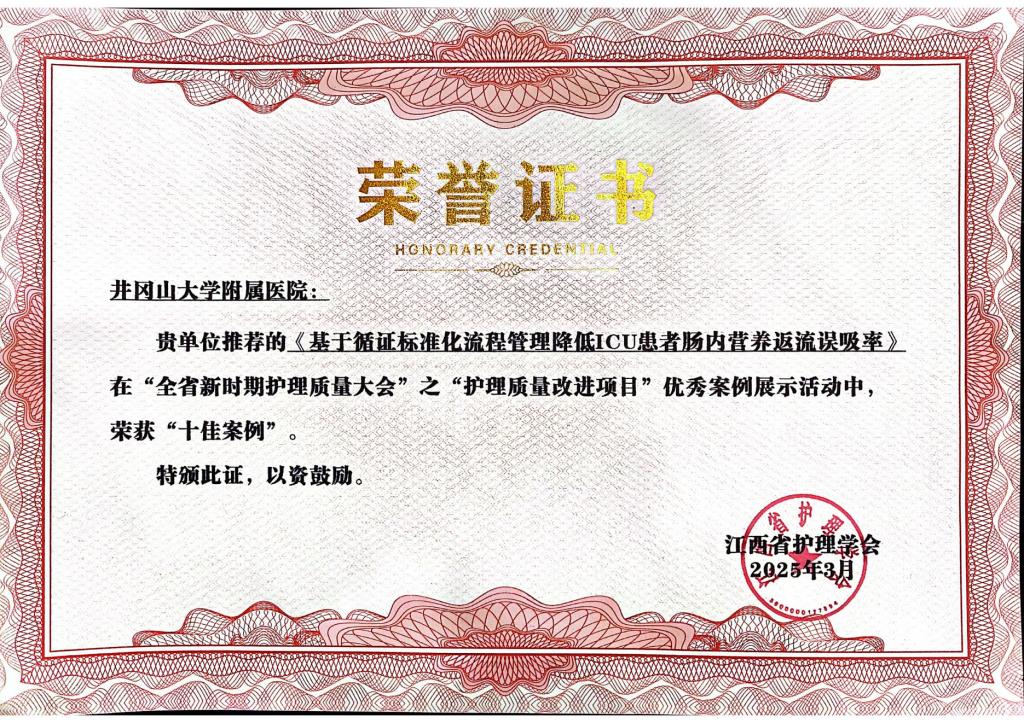 2025年3月14日,在江西省护理学会举办的全省新时期护理质量大会上,我院护理部推送的质量改善案例《基于循证标准化流程降低ICU患者肠内营养返流误吸》,经护理部黄小新与重症监护室护士刘瑾现场展示汇报,在比赛中脱颖而出,荣获全省护理质量改进项目“十佳案例”。(文图:黄小新 审核:陈小英 周臻 彭晓露)