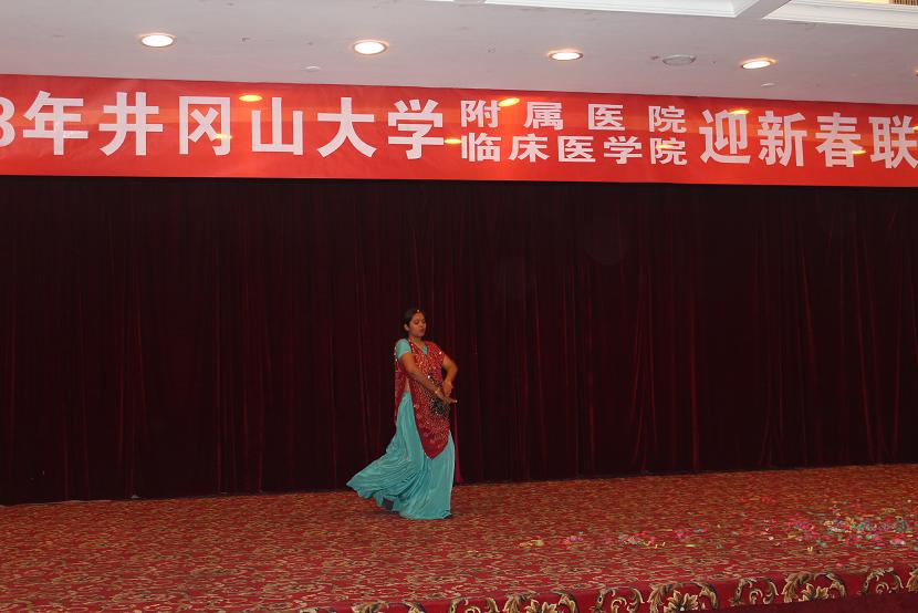 在2013年我院举行的迎新春联欢晚会上,由科教科选送的留学生歌舞串烧节目喜获一等奖。表演者是来自印度的陈雨轩同学和秦丽同学。