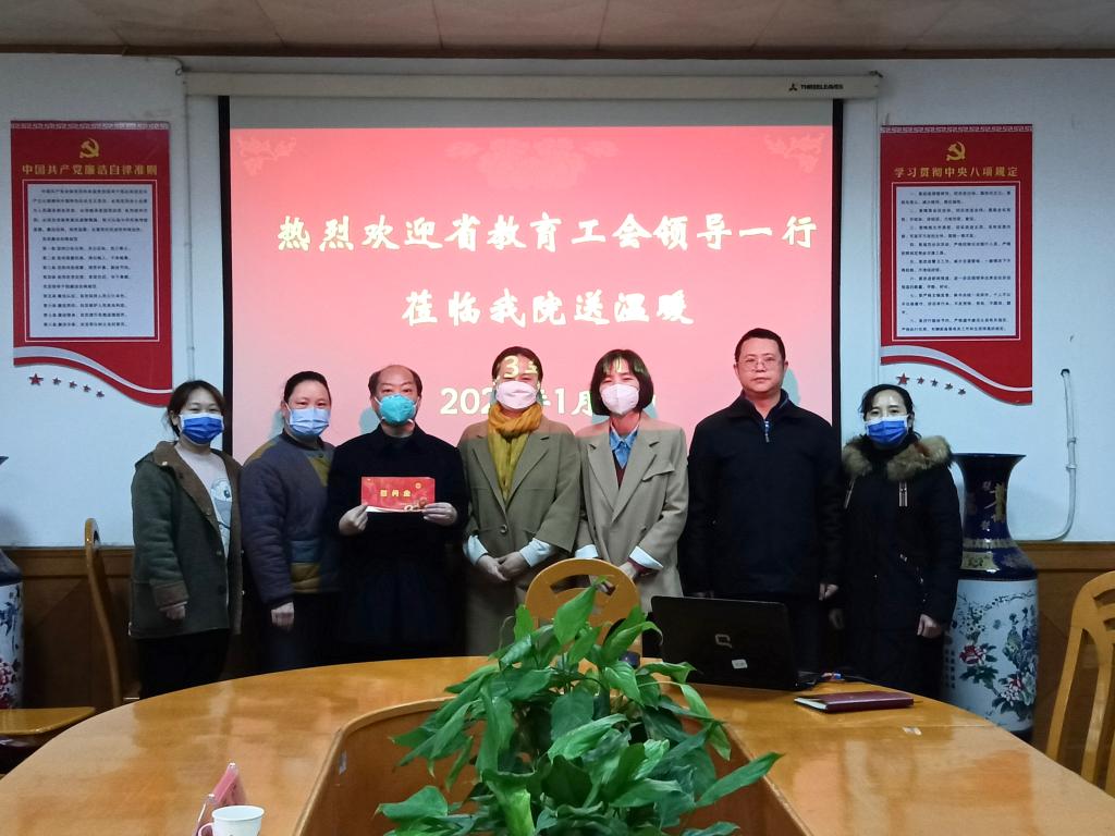 1月11日上午,省教育工会主席黄虹一行来我院开展春节送温暖慰问活动,为医院职工送上新春慰问和祝福。院党委书记肖游章、副书记郭欢和工会主席陈苏桂等出席陪同。