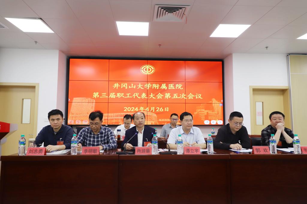 4月26日,井冈山大学附属医院第三届第五次职工代表大会在新院区全科楼二楼学术报告厅圆满召开。井冈山大学党委常委、统战部部长刘梁军出席并讲话,院党委书记肖游章作总结讲话,院党委委员、副院长韦华璋代作医院工作报告,院党委副书记郭欢主持会议。院领导班子、职工代表、特邀代表、列席代表等120余人齐聚一堂,共谋医院发展大计,共擘未来发展蓝图。
