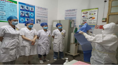 门诊部邀请我院援鄂专家康云主管护师到发热门诊进行指导,针对发热门诊现有的分区布局进行梳理,按照流程规范了物品的摆放;并在发热门诊实地,以新冠肺炎疑似病例咽拭子采集情景案例的形式进行模拟演练。整个演练涵盖了:手卫生、戴脱防护口罩和外科口罩、穿脱隔离衣和防护服、戴脱护目镜面屏、三区区域划分及采集咽拭子。通过演练大家明确了在清洁区、潜在污染区、污染区如何穿脱防护用品,进一步掌握了防护用品的穿脱注意事项及咽拭子采集方法,为今后发热门诊的常态化疫情防控工作奠定了基础。