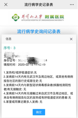 查看结果如上图所示,患者到院就诊时,预检分诊护士可根据患者的电话号码查询已填写的流行病学史结果,极大地缩短了预检分诊的时间,提高了患者就医效率。