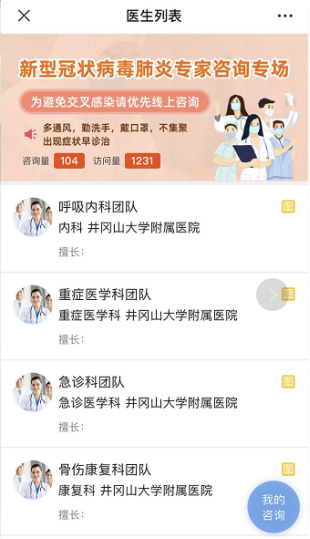 我院作为吉安市首家实现了“互联网+网上问诊”功能的医院,患者可直接关注微信公众号进行线上问诊。我院全体医生都主动报名参与网上问诊咨询,总计组建了22个专家团队。在抗疫期间,患者足不出户,即可获得问诊服务,充分改善了患者的就医体验。