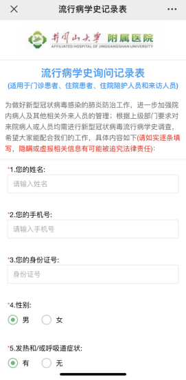 如上图所示,我院在疫情阶段快速部署了“二维码电子化填写到流行病学史”的功能,患者及陪同人员在来我院就诊前,可识别以上二维码,使用手机端填写流行病学史。