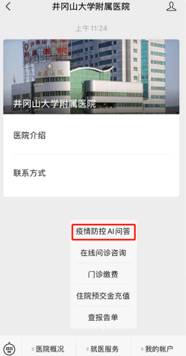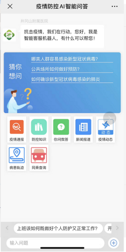 根据江西省卫生健康委员会赣卫医函【2020】31号文件《转发国家卫生健康委办公厅关于在疫情防控中做好互联网诊疗咨询服务工作的通知》附件中有关“智能辅助新型冠状病毒肺炎问诊量表及判断逻辑说明”,我院作为吉安市首家医院,实现智能辅助疫情问答功能。