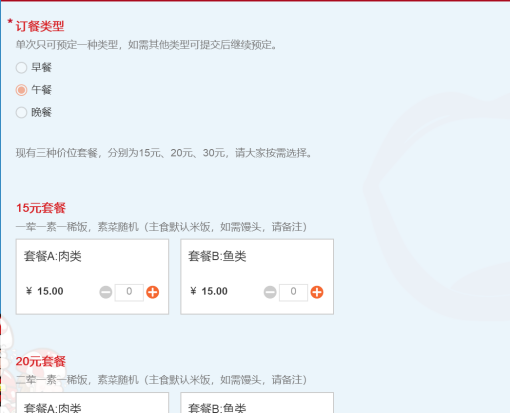 点餐界面如上图所示,患者、陪护家属和医护人员使用钉钉系统,即可方便地选择志愿服务餐厅中的种类套餐。在疫情这个特殊情况下,极大的方便了上班人员和就诊患者。