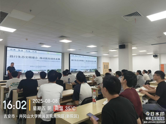 二、8月8日在新院区全科楼一楼会议室举办了以“践行生态文明理念 推动医院绿色发展”为主题的知识科普讲座,讲座中集中学习了习近平生态文明思想,结合医院实际讲解了节能、垃圾分类、绿色出行、低碳消费等理念和行为规范,鼓励践行简约适度、绿色低碳的生活方式,并发起环保倡议。