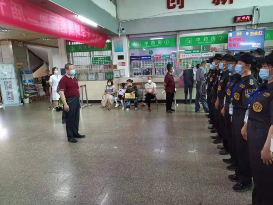 院领导韦华璋副院长对保安公司的到来表示热烈的欢迎,对安保工作作出重要指示:从思想上到行动上强化责任意识,严抓疫情防控工作的同时,积极应对可能发生的各种突发事件,做好及时妥善处置,要求队员们做到“院区有人巡视、矛盾纠纷有人调解、重要部位有人在岗、重点人群有人控制、突发问题有人管理、敏感事件有人上报”,确保医院安全运行。