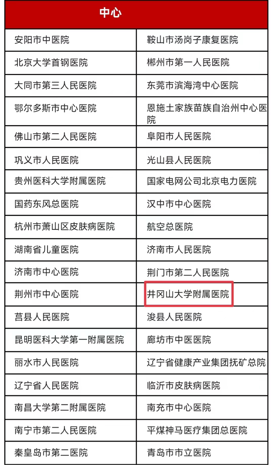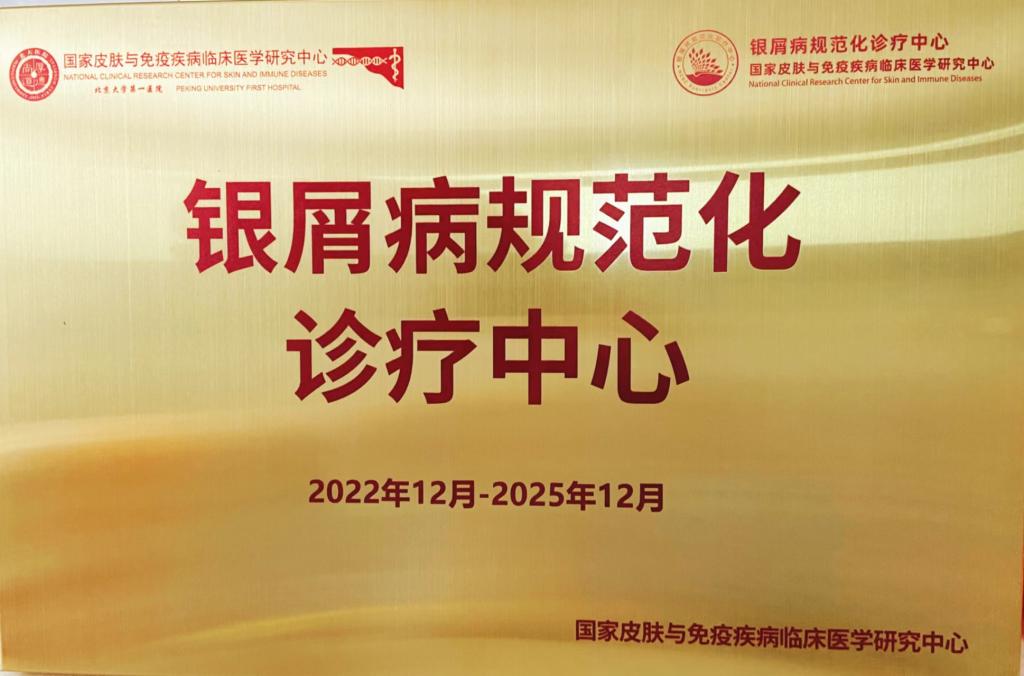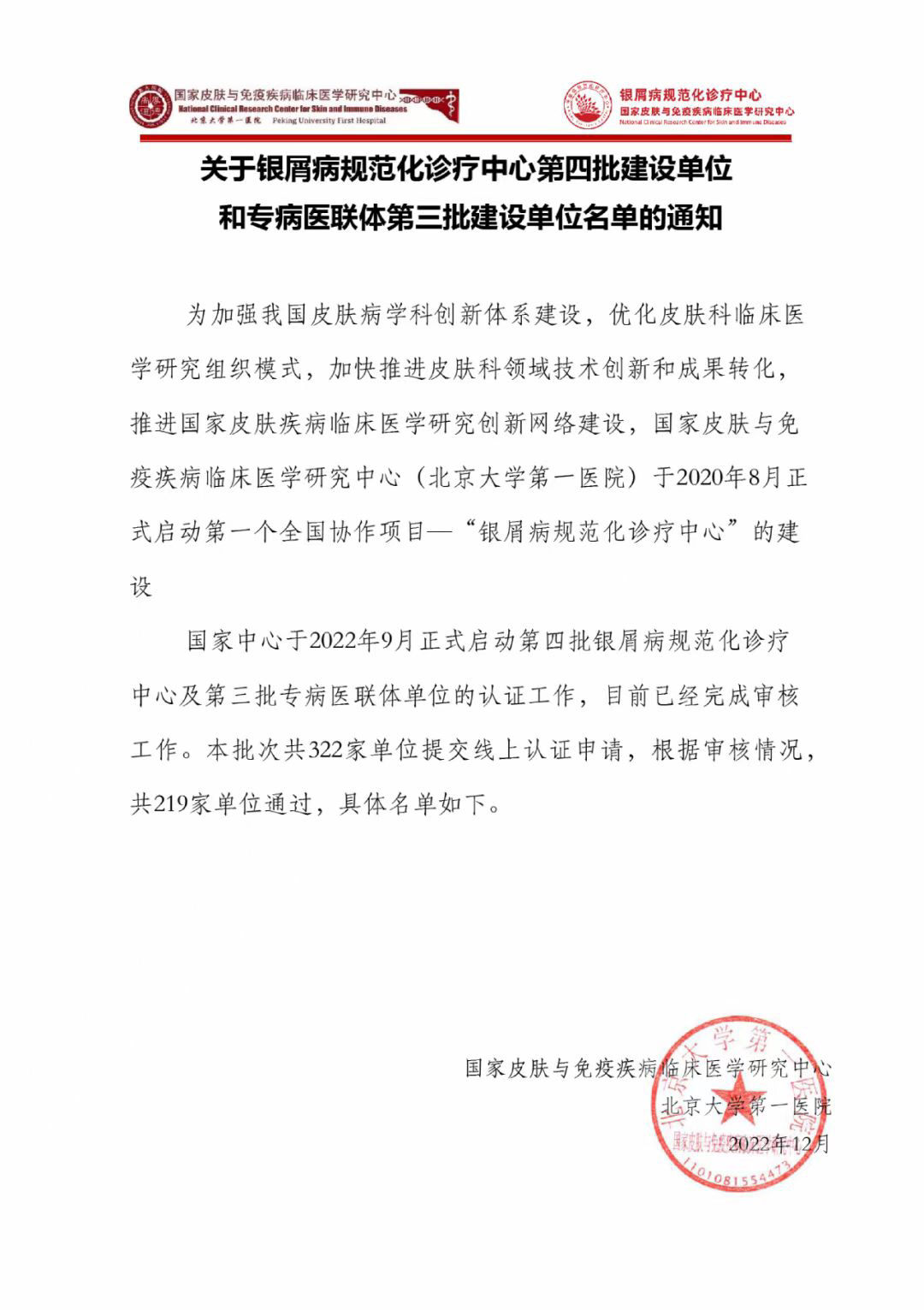 2022年12月29日,国家皮肤与免疫疾病临床医学研究中心公布了第四批银屑病规范化诊疗中心通过名单,井冈山大学附属医院成功上榜,成为吉安市唯一一家获批的医疗机构。这标志我院皮肤科在银屑病规范化诊疗方面获得专业化认可。